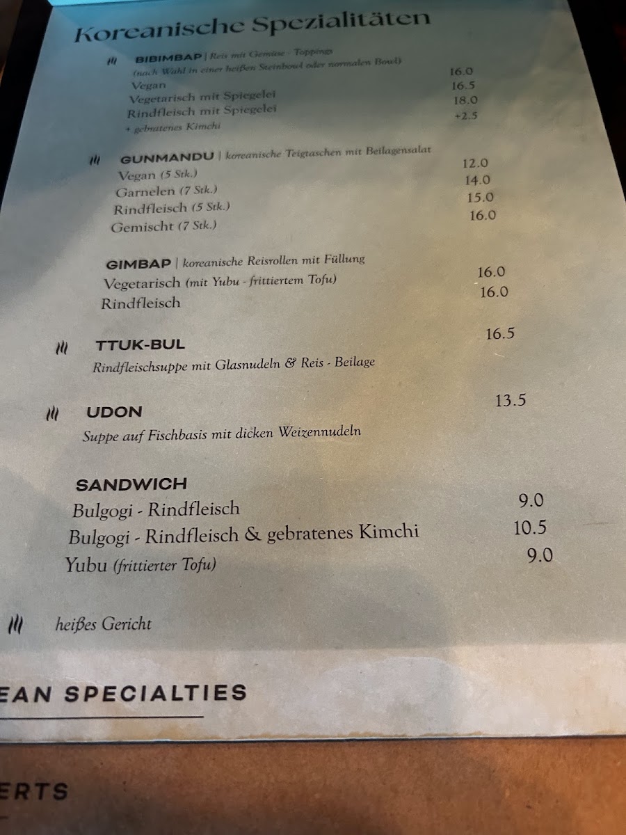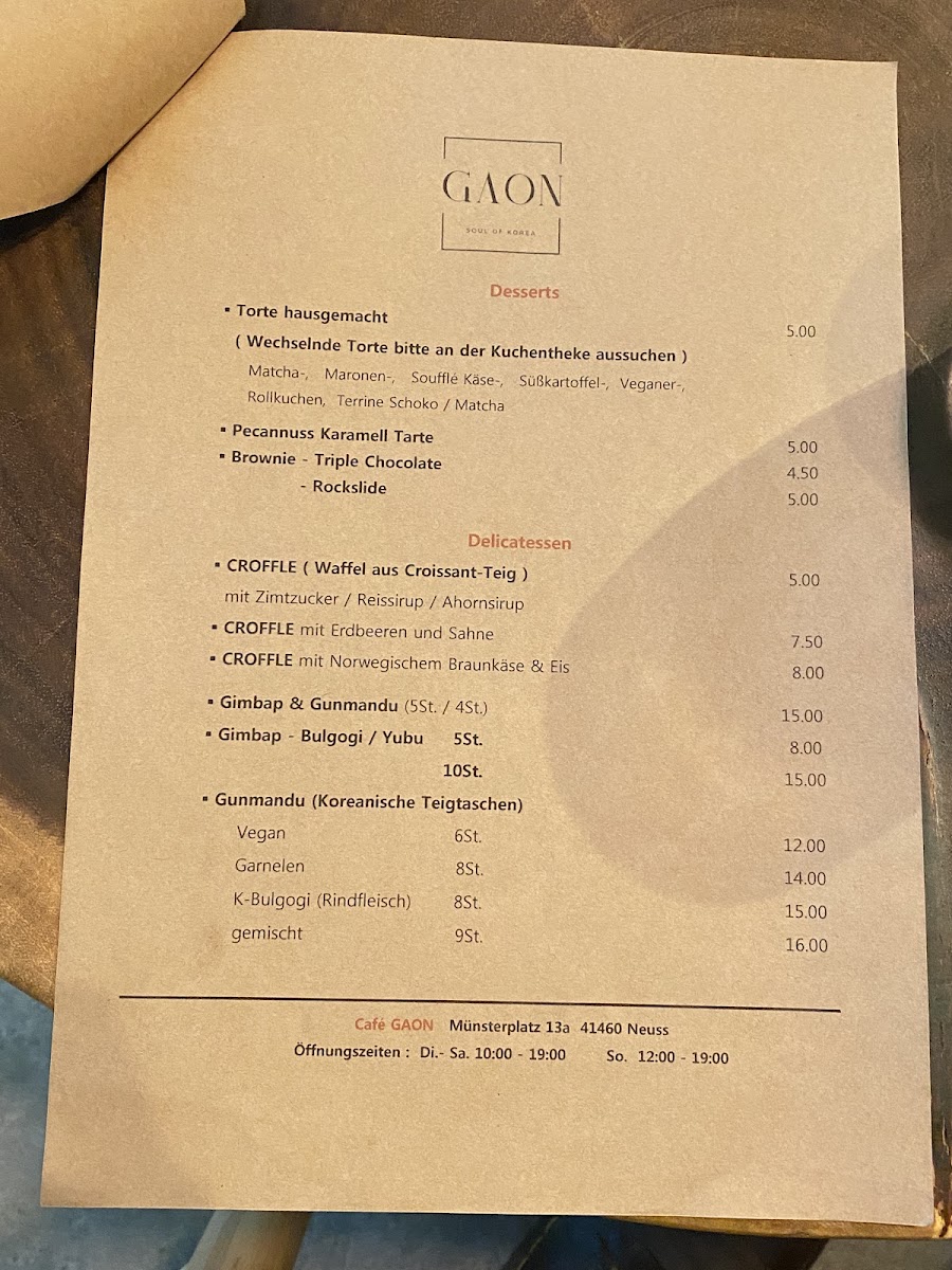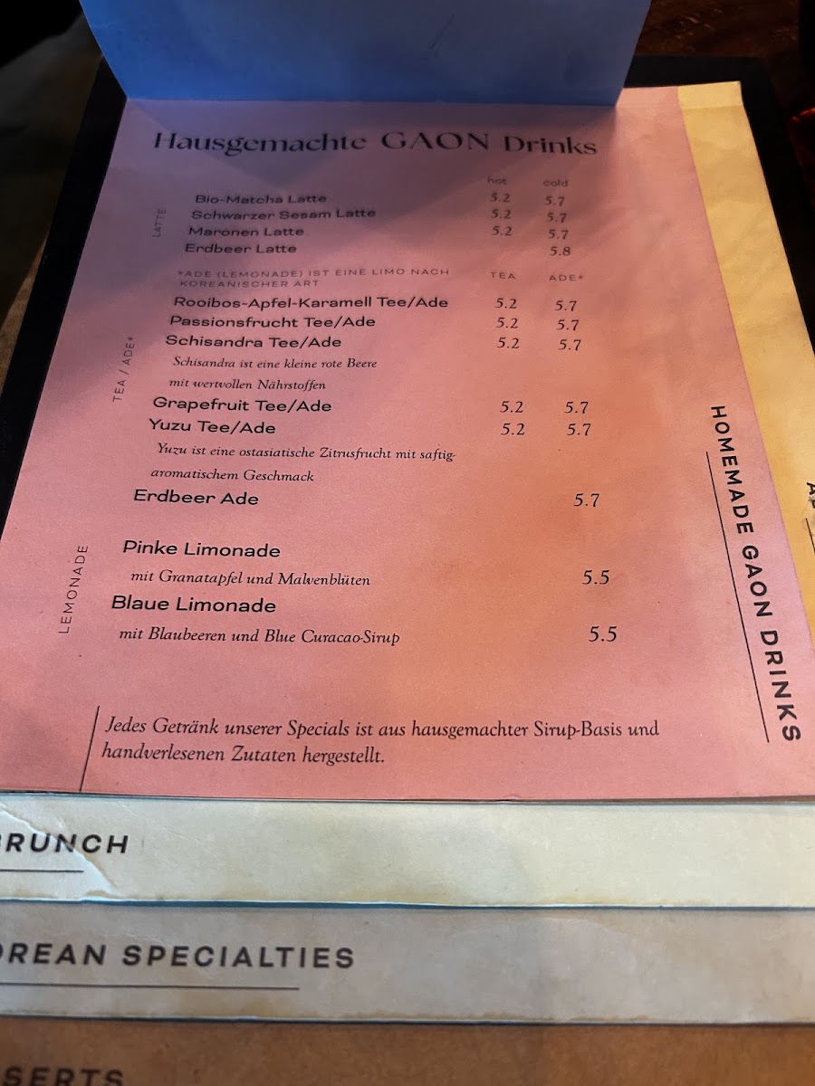 The menu at Café GAON - Soul of Korea offers a range of Korean-inspired dishes alongside a variety of coffee and tea beverages. Visitors can find traditional Korean mains such as bibimbap with beef, complemented by multiple latte options including black sesame latte, hot matcha latte, maronen-latte, and moccachino. Cold beverages like ice matcha latte are also available.